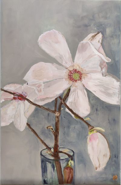 Magnoliatak in vaas, olieverf op linnen, 50 x 80 cm